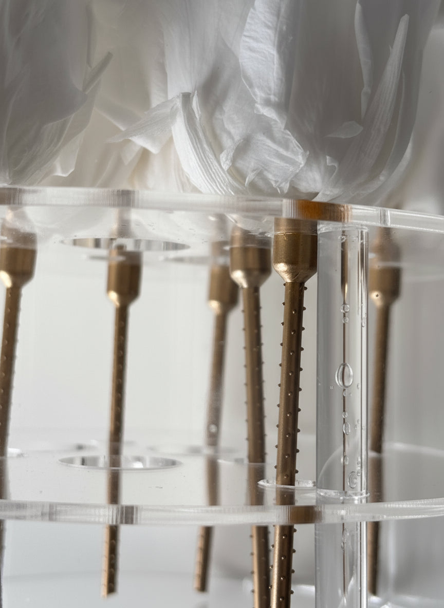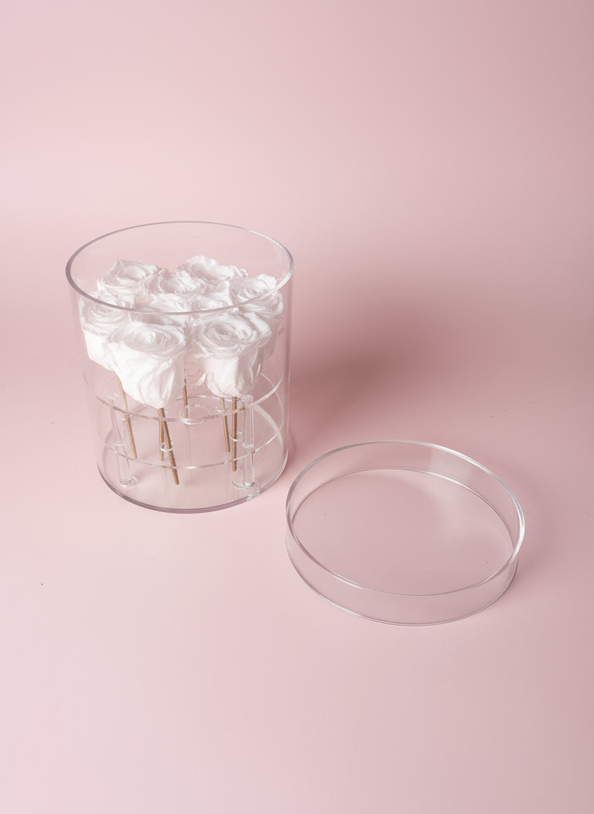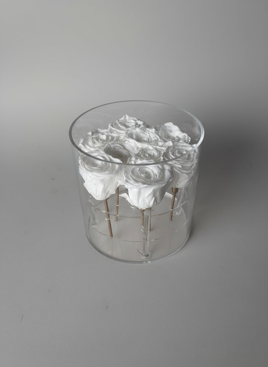 A timeless masterpiece of purity and elegance. The Eternal Grace arrangement features at least 9 pristine preserved roses, delicately displayed in a crystal-clear cylinder. Each bloom is elegantly positioned on individual metal stands, elevating their beauty while preserving their perfection. A stunning statement of love, luxury, and everlasting grace.